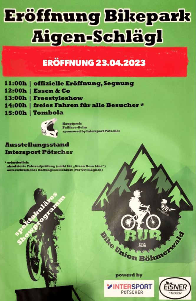 Am Samstag, dem 1. Oktober 2022, hätte die feierliche Eröffnung des BUB Bikeparks in Aigen – Schlägl stattfinden sollen. Wegen Schlechtwetter wurde jedoch auf 23.04.2023 verlegt. Dann sind auch Rider ohne BUB Mitgliedschaft herzlich willkommen! Je nach Alter und Riding-Skills sind die Lines an diesem Tag für euch befahrbar, natürlich unter entsprechender Aufsicht und unterzeichnetem Haftungsausschluss, den ihr euch hier downloaden könnt. Dieser muss vor Benützung der Lines unterschrieben abgegeben werden. Bist du noch minderjährig und kommst zum Beispiel mit deinen Eltern zu uns, kann dieser auch direkt im Bikepark abgeholt und unterzeichnet retourniert werden.