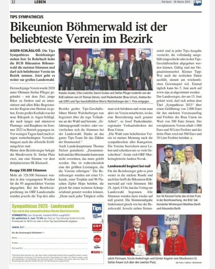 SYMPATHICUS 2023 – Die BUB auf PLATZ 1 des beliebtesten Vereins im Bezirk Rohrbach! ❤️