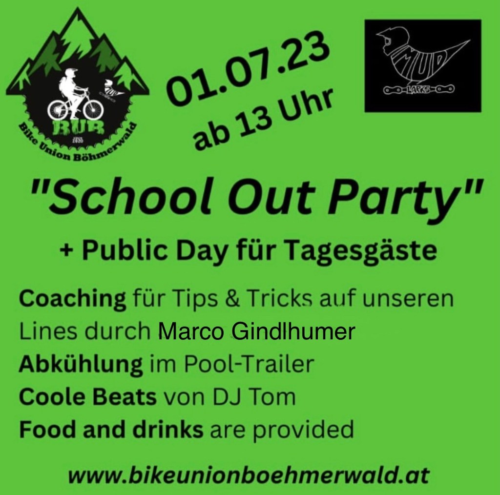 Am 01.07.2023 ab 13:00 findet in Kombination mit dem BUB public Day auch die School out Party statt! Es erwartet euch ein Coaching auf den Lines mit Marco Gindlhumer, seinerseits Trek DH Werksfahrer a.D., auch staatlich geprüfter MTB Guide und Instructor. Jetzt arbeitet er zusätzlich für Trek im Marketing. Bis 16:00 habt ihr die Möglichkeit, euch von Marco Tips und Tricks zeigen zu lassen, natürlich stehen euch auch unsere locals zur Seite. Auch ein Pool-Trailer wird zur persönlichen Abkühlung im Park sein, DJ Tom ist für die musikalische Untermalung bereit. Da zurzeit das Brennholz sehr teuer ist 😉, könnt ihr gerne eure nicht mehr in Gebrauch stehenden alten Schulbücher und Hefte mitnehmen und damit unseren BUB – Hellfire – Feuerkorb so richtig einheizen. 😈 Ab 17:00 gibts Knacker, Käsekrainer und Zubehör. Sei dabei, es wird ein tolles Event!