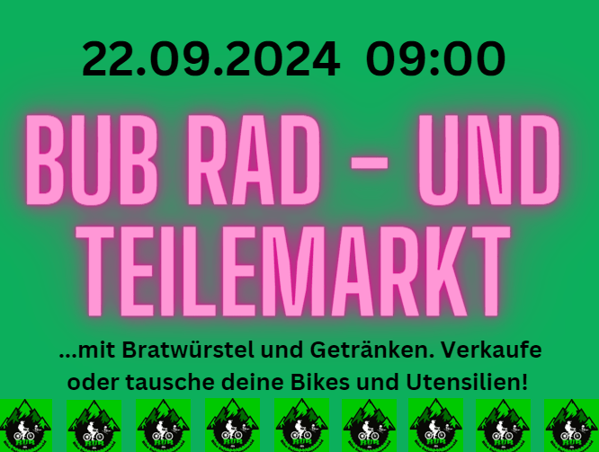 Am 22 September lädt die Bike Union Böhmerwald zum ersten Rad und Teilemarkt im Bikepark Aigen-Schlägl ein. Sie erhalten Zutritt auf das Bikeparkgelände der BUB und können vom Pedal bis zum fertigen Gebrauchtrad nach Herzenslust abstauben. Sie möchten selber im Bikepark Ihre Gebrauchtbikes und andere Tools anbieten? Kein Problem, für 13€ Standgebühr pro Tisch können Sie das bei uns in die Tat umsetzen. Untermalt von cooler Musik und Angeboten wie Bratwürstel und Getränken, verbringen Sie mit uns einen super Sonntag mit Freunden und Bekannten. Anmeldungen für einen Verkaufsplatz bitte unter +43 677 63810044 bei Herrn Obmann Stefan Pfleger-Lindorfer. Danke für eine kleine Spende als Marktbesucher zum Erhalt des Parks! ❤️ VIEL SPASS WÜNSCHT DIE BUB!Am 24 August findet im Bikepark Aigen-Schlägl der BUB ein OPEN DAY KIDS speziell für Kinder unter 10 Jahren statt. In Begleitung von mindestens einem für das Kind verantwortlichen Erwachsenen, (ein Haftungsausschluss ist vor Ort zu unterschreiben), können nach Mut und Skills die verschiedenen Lines des Parks befahren und getestet werden. Sei dabei beim BUB OPEN DAY KIDS und verbringe einen Tag im BUB Bikepark. Bei Schlechtwetter ist als Ersatztermin ist der 15.09.2024 vorgesehen. HAVE FUN! ☀️
